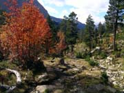Aneto (3404m) a l'esquerra, Tempestats (3290m) entre els arbres, i Rusell (3205m) més a la dreta