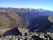 La vall de Barrosa des del Robinyera. Al fons el Culfreda (3033m) (al seu davant s'endevina el llac de Trigoniero), davant del Bachimala (3177m), i més a la dreta Posets (3375m) i Eristes.