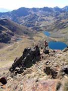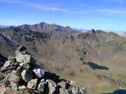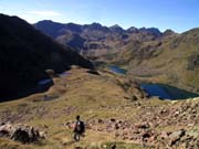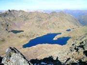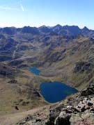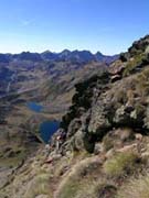 Pendents drets sobre els llacs. Al fons, pic Pla de l'Estany, Comapedrosa (2942m), Roca Entrevessada (2927m), Medacorba (2913m) i Lavans (2893m)