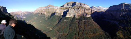 Mirador de Calcilarruego (1950m), des de l'entrada d'Ordesa (amb Penya Otal al fons), el Gallinero i el cercel de Cotatuero. AL fons apareix la cresta de Marboré amb el Casc (3006m) i la Torre de Mmarboré (3012m) |