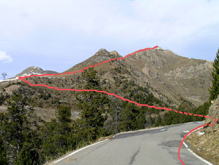 L'ascensió Es surt des del Coll de la Botella. Després de fer uns metres per la carretera (quan hi ha neu) s'arriba a un segon collet. Agafant un corriol per la dreta es puja cap a una torre del telefèric. A partir d'aleshores es va progressant pel vessant herbòs, tot girant cap a la dreta fins anar a trobar la carena ja prop del cim. Sense problemes s'arriba al cim