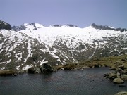 Llac de Toro. En primer terme el pic d'Aigualluts.Al fons (esquerra) el Tuc de Mulleres (3010m)