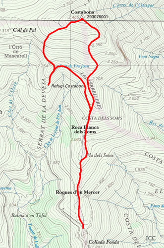 A la Collada Fonda (1900m) s'hi arriba per pista forestal, bé des de Setcases, bé des d'Espinavell