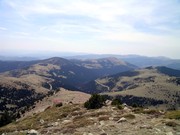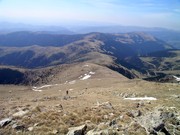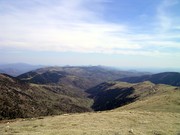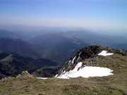 Vallter des de la carena: Gra de Fajol (2706m) al centre, Pic de Bastiments (2888m) a la dreta, i enmig i al fons, els pics del Freser, amb el Pic de l'Infern (2861m)