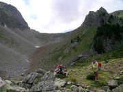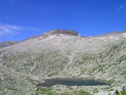 Balsa (2590m), prop de l'Ibón Alto, amb el piló de colls de fons. No confondre's! La collada de Montidiego és el petit collet que apareix en la carena (centre de la imatge), no el coll del fons!