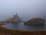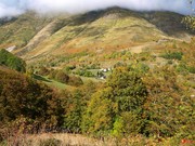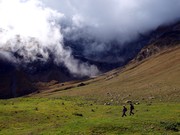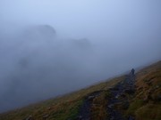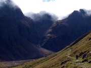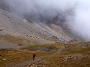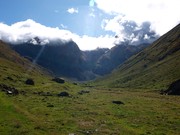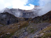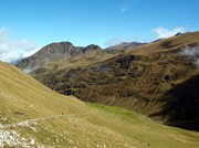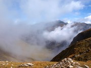Inici de la vall de la Gela (a 1704m). Es veu la profunditat de la vall de la Gela. Al fons a la dreta surt el pic de Troumousse (3085m) entre la boira