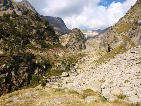 VALL DE REMUÑÉ Excursió familiar als llacs de la vall de Remuñé En la carretera de Benasc als plans de l'Hospital arribar fins al fons, sense baixar als Plans de l'Hospital Un corriol, després del barranc de Remuñé, ascendeix per la vall fins a una pleta a 2050m. A partir d'aquí es pot realitzar una excursió circular pels llacs de Remuñé. Camí lleugerament marcat sobre l'herba i amb fites |