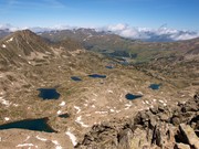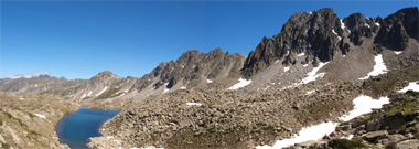 D'esquerra a dreta, pic Negre d'Envalira, pic de Montmalús, pics de Ribús i pic dels Pessons, amb el llac del Cap de Pessons