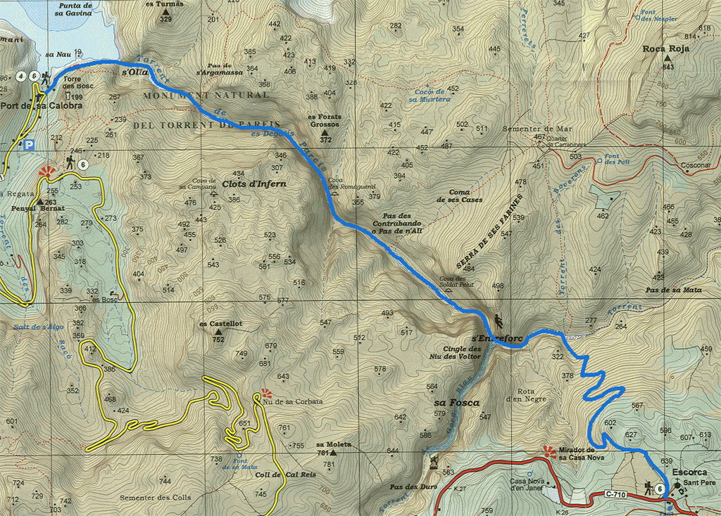 L'excursió Se surt d'Escorca, en la carretera de Lluch a Sóller Tot i ser una excursió senzilla, cal recordar que és exigent: tota de baixada, només 600m, però des del moment en què s'arriba al llit del torrent es salta sobre pedres fins que s'arriba al mar. Tot i que es va baixant sobre pedram, si es segueixen bé les marques només cal anar en compta en tres passos (més empipadors que difícils) que cal desgrimpar, especialment en el dels 'grassos estrenyeu-vos' (ja cap al final del torrent), on lo lliscant de la paret no et deixa posar bé per saltar en el gorg (normalment sec) Si es fa en el mes d'agost lo normal és no haver-se de mullar