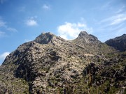 Cap al sud el Castellot petit i, al fons, el Massanella. Des d'aquí es veu bé la diagonal de mata que permet arribar al collet entre l'agulla de l'esquerra i el Castellot petit
