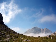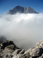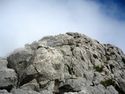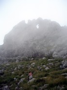 A punt d'arribar a una pedra gran que serveix de fita. Els forats en l'agulla que hem rodejat indiquen que es va pel bon camí. La boira torna a sortir...