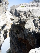 Baixant cap a Sa Calobra es veuen bé els Castellots. També es veu el forat en la cresta del Castellot gran (el de l'esquerra)