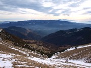 La vall d'Ogassa pujant prop de la Portella. En la serra del mig el Puigsacalm, i el Montseny al fons