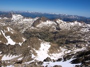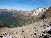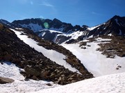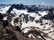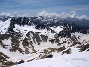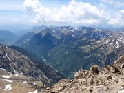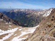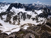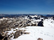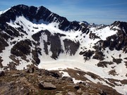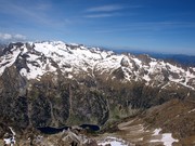 Una vista meravellosa: cap al nord-oest el Montarto i el llac de les Monges. A mig el port de Caldes i les agulles de Travessani. Just a sota el coll Arenós i el llac de la Roca o del Mamut, encara glaçat. Al fons Mauberne i Mont Valier