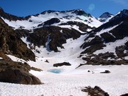 Estanyol sobre l'estany gran, punt on hem de girar (ben bé a l'esquerra de la foto) per anar a grimpar sobre el llom del Comalesbienes. Les Crestes Barrades tanquen el cercle
