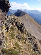 El primer tram de la cresta es veu trencat. Hi ha com una mena de corriol pel costat est de la cresta, per on pugem