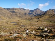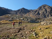 Pujant per sobre les Basses de Rat. El Pic de l'Estany Forcat i el Tristaina tanquen el cercle