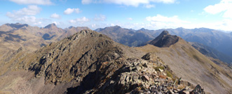 I arribem a dalt. La vista cap als pics alts d'Andorra, i fins a la Pica d'Estats, és impressionant. D'esquerra a dreta: en el nucli de primer terme Coma Pedrosa, Roca Entrevessada, Bayretes-Medacorba i Lavans; Pica Roja (enmig de la cresta) i Pica d'Estats al fins