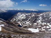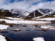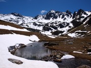I a sota els estanys de l'Angonella, el superior encara glaçat. Al fons a la dreta surt el Cadí