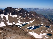 Panoràmica des del coll de Pondiellos: estanys de Pondiellos, Infiernos i Arnales. A la neu del final de tot de la canal dels Infiernos s'hi veuen 3 piquets. Són 3 persones que estan baixant!!!