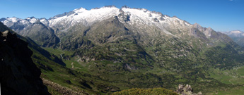 Panoràmica de la Maladeta, des de la Forcanada al Pic d'Alba. En primer terme a l'esquerra el pla d'Aigualluts. La Besurta als nostres peus. El Plan d'Estan més a la dreta. I al fons de tot a la dreta surt el Posets