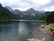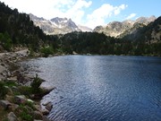 Estany de Sant Maurici. A la dreta de les agulles del fons, s'hi endevina el Tuc de Ratera