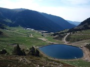 L'Estany de Bacivers, ben rodó, encara glaçat. Al sud el Bastiments