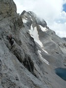 Uns cent metres més amunt del llac, i enmig de la paret, hi ha una lleixa planera d'amplada suficient, que et deixa passar a l'altre costa del coll
