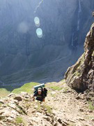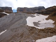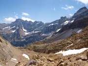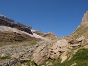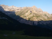 Refugi de Serradets des del coll homònim. Les parets del cercle, sota el Marboré són impressionants
