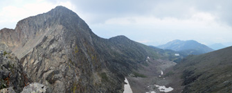 Des de la Portella de Valmanya (2590m), girant cap al nord, ja apareix la Pica. Es veu el Canigó. Els piquets blancs enganxats a la paret són la gent que puja amunt!