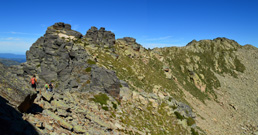 Vista (al sud) cap al Pic d'Escobes. El camí baixa uns 20m per anar, tot passant primer una pedra pel costat oest, cap al collet que hi ha entre la punxa que es veu a l'esquerra i el pic