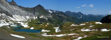 Llacs i refugi de Barroude. Al fons el massís del Campbieil