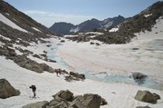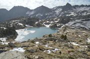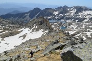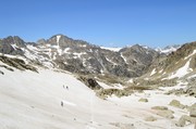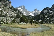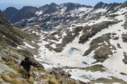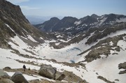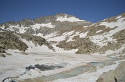 Per anar cap al coll de Monestero (queda al fons entre el Peguera i el Monestero) passem entre l'estanyol glaçat (a la dreta) i l'Estany de la Llastra