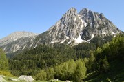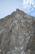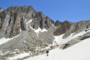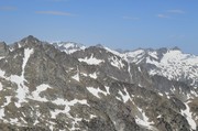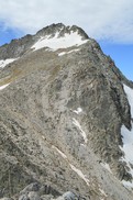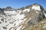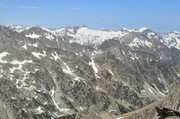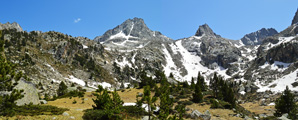 Des de la Girada Gran, El Peguera i el Pic de Mar són impressionants. A l'esquerra surt el Monestero. El corriol passa pels pendents de l'esquerra, com aquell que vol pujar per la canal de neu que baixa recte de mig el Peguera