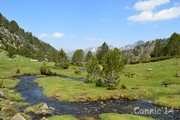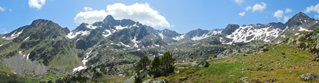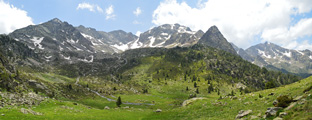 Planers abans d'arribar als Estanys d'Escorbes. Es veuen el Pic de Lavans (la punxa!), amb el Medacorba i Roca Entrevessada (es veuen enganxats), el Pic de Baiau, Portella de Baiau, Sanfonts, pic de Vallpeguera i pic d'Escorbes