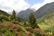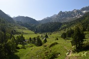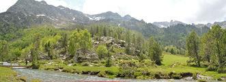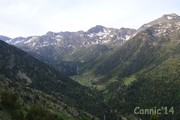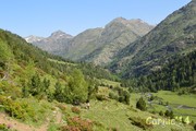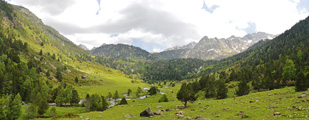 Vista del Pla de Boet des del camí de sobre el refugi de Vall Ferrera. La Portella de Baiau és el coll del fons a la dreta