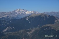 Zoom cap al Mont Perdut. Es veuen perfectament les Tres Serols, Pic d'Anyisclo (3263m) - Mont Perdut (3355m) - Cilindre de Marboré (3328m), Marboré (3250m) i Astazús (3071m), i entre aquests dos la vall penjada, encara nevada, de Marboré. Al fons surt el Vignemale (3298m)