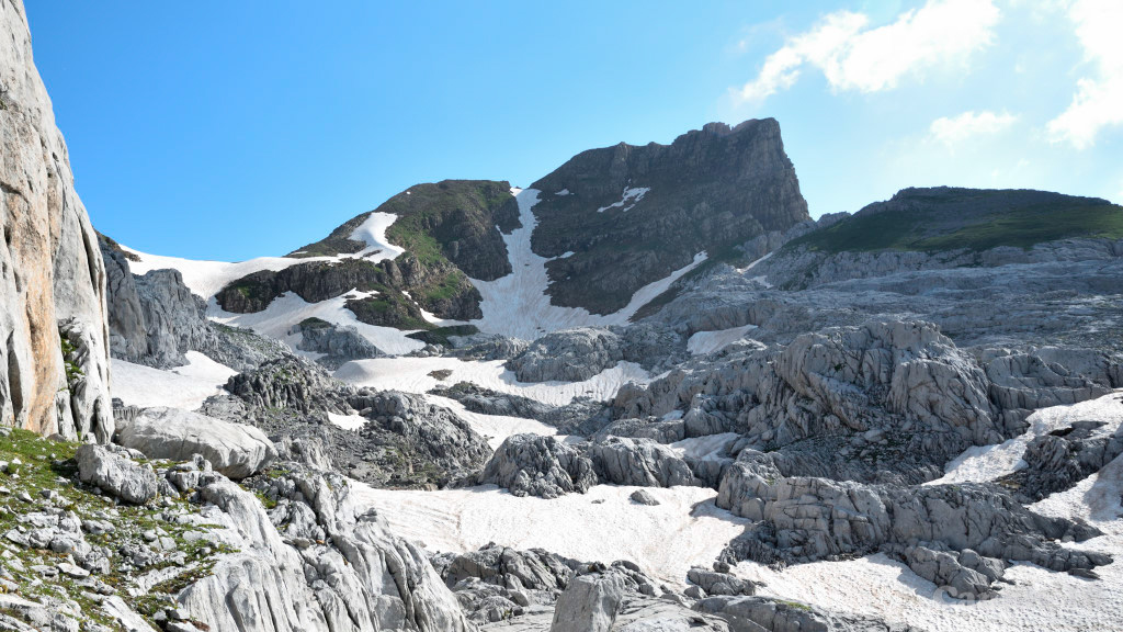 Entrada a la valleta càrstica sota el pic d'Aspe, que ja es veu al fons