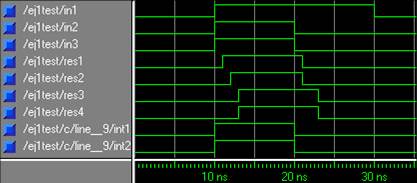 Puede comprobarse como las señales conmutan con los retardos típicos de la propagación de señal en una interconexión, mientras que las variables conmutan en un mismo momento y dependen del orden cóm se escriben