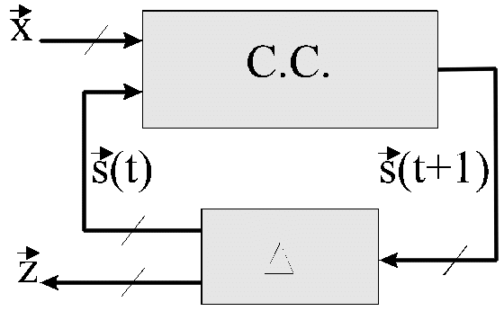 A nivel de circuito, CC significa que el cálculo de las funciones se realiza a través de circuitería combinacional y el retardo delta representa a los retardos asociados al circuito que, cuando se trata de circuitos secuenciales síncronos corresponde a los flip-flops. La siguiente figura muestra un esquema del interior de un circuito secuencial