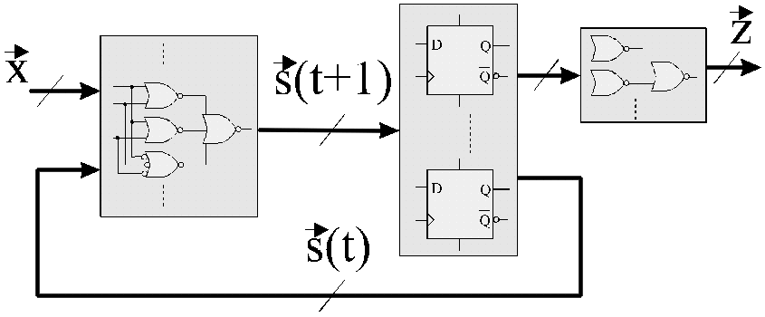 donde s(t) corresponde al estado actual, s(t+1) el estado futuro, z(t+1) la salida del circuito y x(t) las entradas en el instante actual