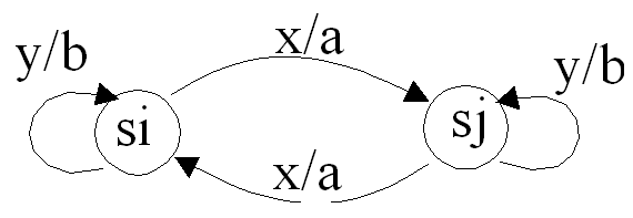 La forma como se especifiquen las salidas significará que estemos trabajando en una máquina tipo Mealy o tipo Moore. Así, en el siguiente ejemplo, las salida a corresponde a la salida típica de una máquina tipo Moore, mientras que b es una salida típica de una máquina tipo Mealy